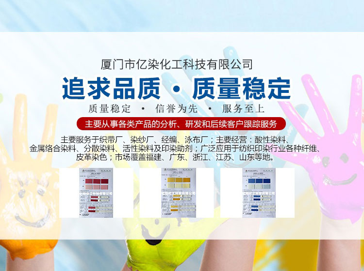 廈門(mén)市億染化工科技有限公司是一家集研發(fā)、生產(chǎn)、銷(xiāo)售一體的綜合型企業(yè)。公司主要經(jīng)營(yíng):酸性染料、金屬絡(luò)合染料、高牢度分散染料及印染助劑。公司信守“以誠(chéng)信贏合作、以質(zhì)量贏市場(chǎng)、以創(chuàng)新贏發(fā)展、以服務(wù)贏生存”的企業(yè)精神服務(wù)于廣大客戶,多年以來(lái)建立了良好的市場(chǎng)口碑,市場(chǎng)遍布福建、廣東、浙江、江蘇、山東及東南亞國(guó)家,與多家知名企業(yè)建立了長(zhǎng)期合作伙伴關(guān)系!
